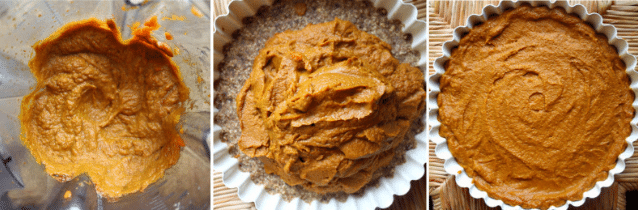 - Add all ingredients for the pumpkin pie filling to a Vitamix and blend until everything is creamy and smooth. Make sure to remove the pits from the Medjool dates before adding them in.